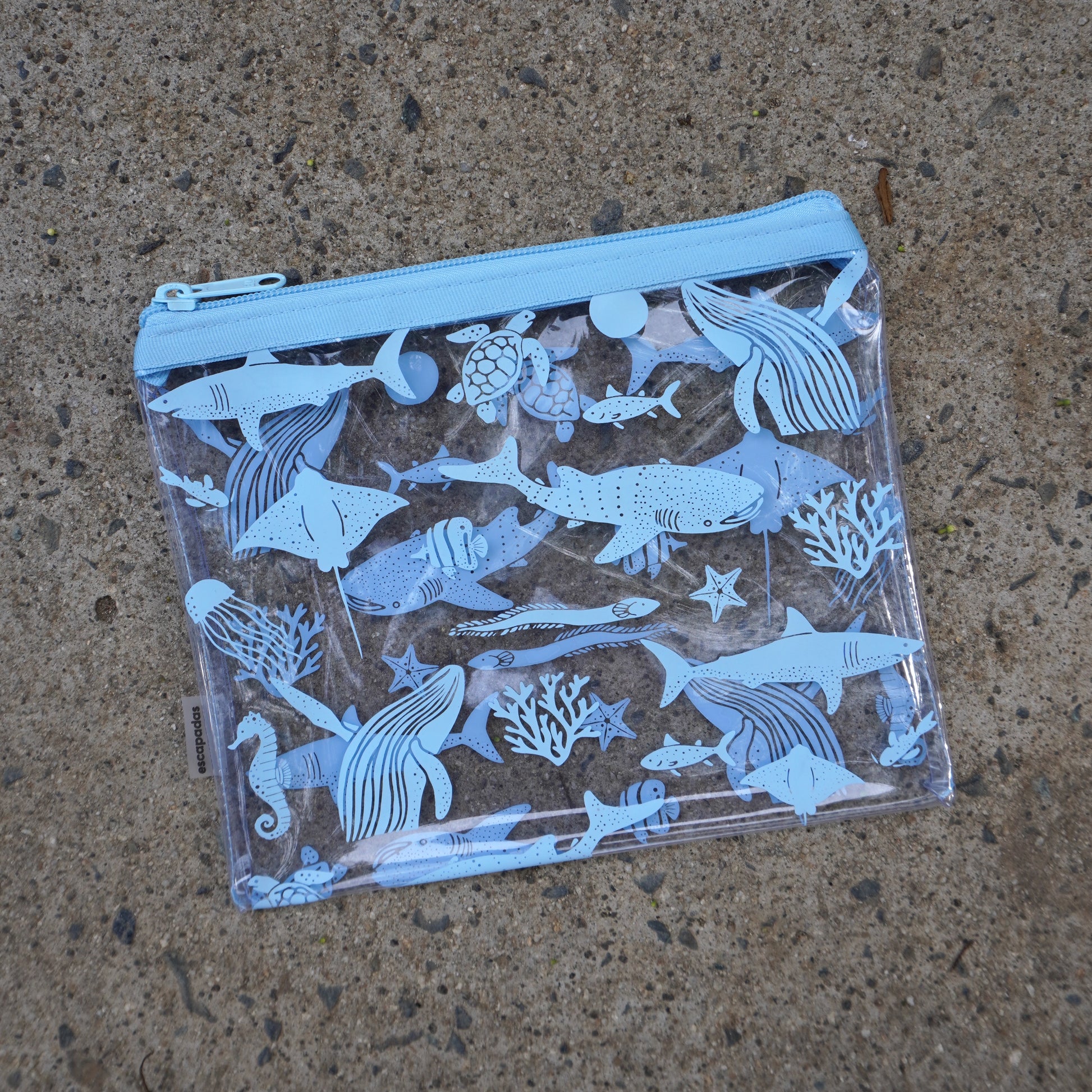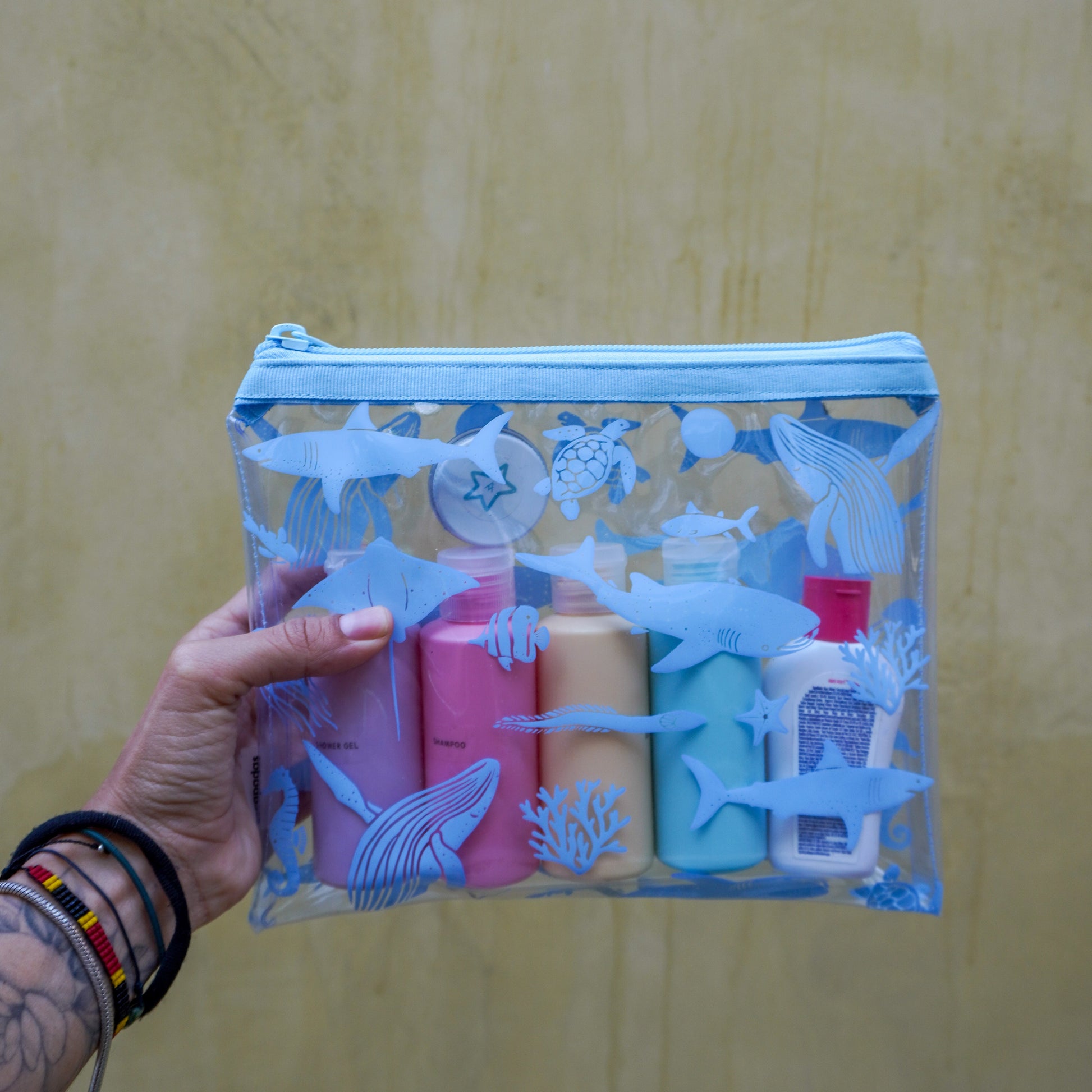 Cosmetiquera transparente con estampado de la fauna marina del pacífico.